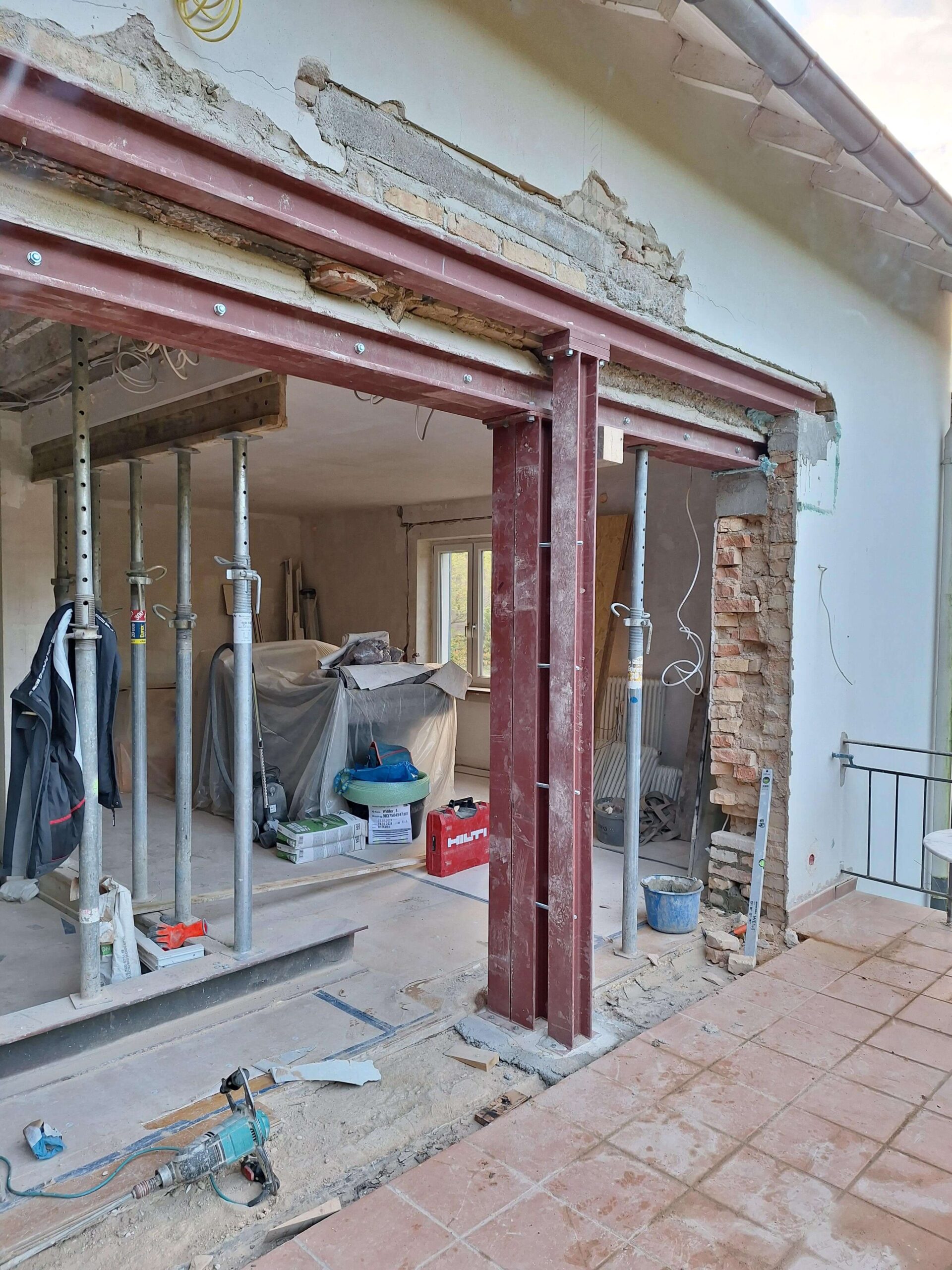 Eine besondere Herausforderung stellte der erschwerte Zugang zur Hausrückseite dar. Da der Einbau der Stahlträger nur über einen eingeschränkt zugänglichen Bereich erfolgen konnte, war eine sorgfältige logistische Planung sowie eine präzise Abstimmung der einzelnen Arbeitsschritte erforderlich. Trotz der beengten Verhältnisse konnten die Bauteile sicher eingebracht und fachgerecht montiert werden. Dadurch wurde die Grundlage für die geplante neue Raumaufteilung geschaffen und die statische Sicherheit des Gebäudes dauerhaft gewährleistet.
