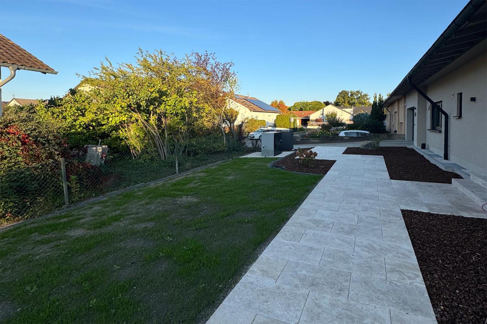 Parallel dazu wurden Kernbohrungen durchgeführt, um Durchführungen für Leitungen und technische Installationen zu schaffen. Ergänzend erfolgten Entwässerungsarbeiten, die eine zuverlässige Ableitung von Regen- und Oberflächenwasser gewährleisten. Ein weiterer Schwerpunkt lag auf der Abdichtung des Hauses, um das Gebäude dauerhaft vor Feuchtigkeit zu schützen. In diesem Zuge wurden auch Dämmmaßnahmen umgesetzt, die den Wärmeschutz und die Energieeffizienz des Gebäudes verbessern. Darüber hinaus wurde ein neuer Kellerabgang erstellt, der den Zugang zum Untergeschoss erweitert und in das bestehende Gebäude integriert. Abschließend wurden im Außenbereich Pflasterarbeiten ausgeführt, um Wege und Flächen dauerhaft nutzbar zu machen und die Außenanlage aufzuwerten.
